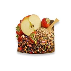 A fruit filled mélange of health is brewed up with this combination of a fruity herbal tea and green rooibos from South Africa. Rooibos is a caffeine free herb that is very high in antioxidants, acts as an antispasmodic, aids in digestion, is great for skin, helps reduce allergies, and is full of vitamins and minerals. This combination is comprised of Rooibos, lemongrass, apple bits, pomegranate pieces, strawberries, raspberries, citrus peel, and a selection of flower petals, rosehips and hibiscus. This blend is wonderful as a hot or iced tea.